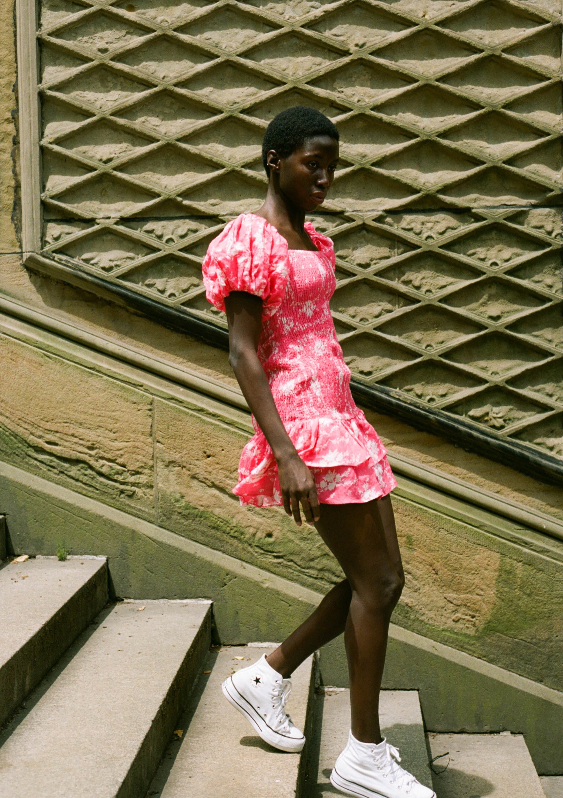 Easy, our smock mini dress with gorgeous puff sleeves. Feels like the first day of spring.